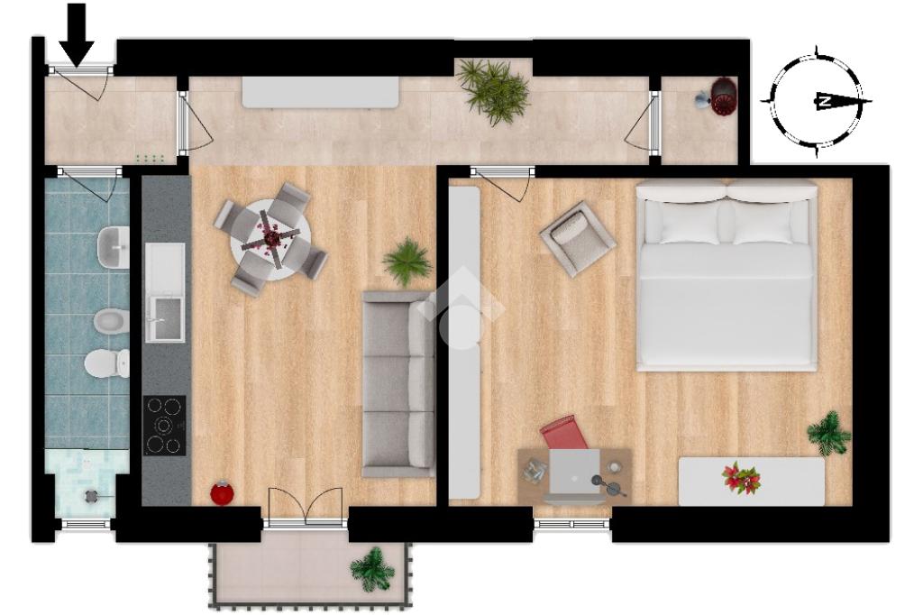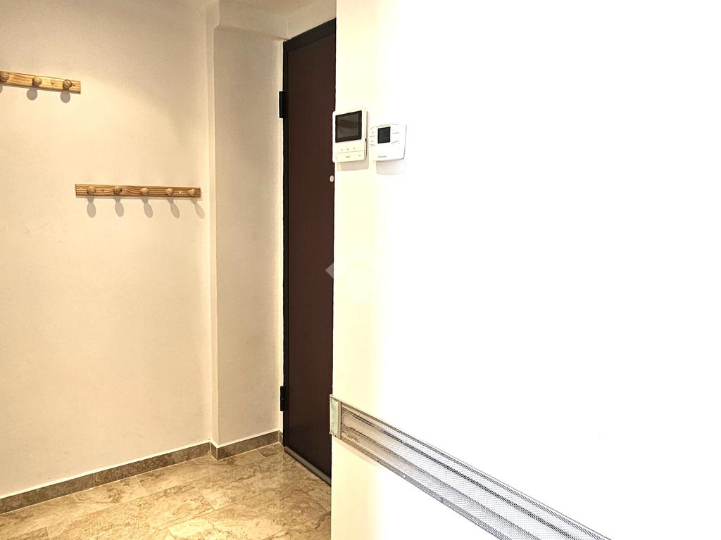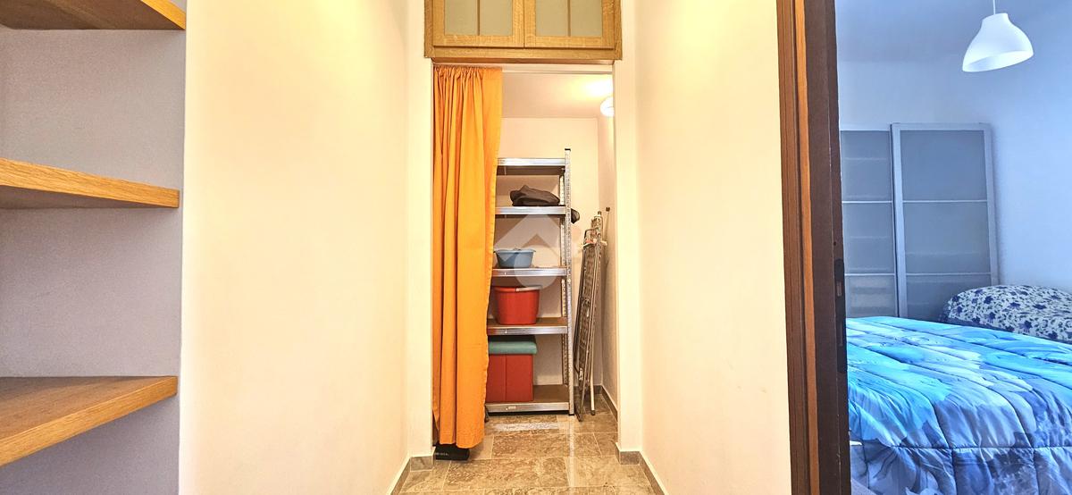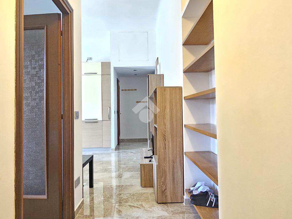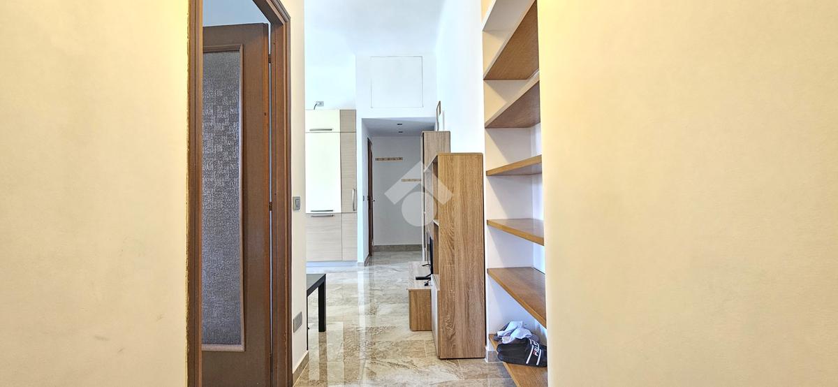 Entrando nell'appartamento si viene accolti dal vano ingresso. Frontalmente si ha la porta del bagno con finestra e doccia, a sinistra si accede all'area soggiorno con angolo cottura, illuminato da una porta-finestra che conduce a un balcone. Proseguendo dritto, oltrepassando il soggiorno, si trova frontalmente un ripostiglio e sulla destra la camera da letto matrimoniale.