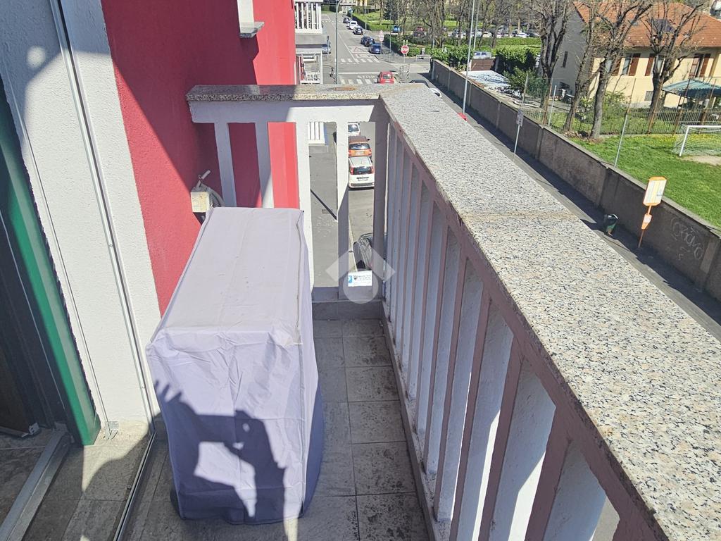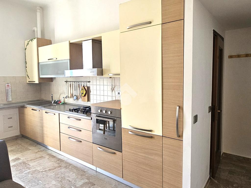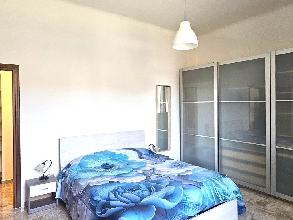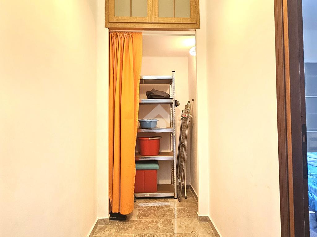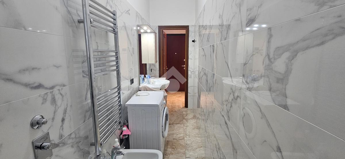 Entrando nell'appartamento si viene accolti dal vano ingresso. Frontalmente si ha la porta del bagno con finestra e doccia, a sinistra si accede all'area soggiorno con angolo cottura, illuminato da una porta-finestra che conduce a un balcone. Proseguendo dritto, oltrepassando il soggiorno, si trova frontalmente un ripostiglio e sulla destra la camera da letto matrimoniale.