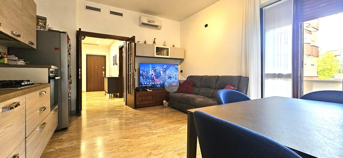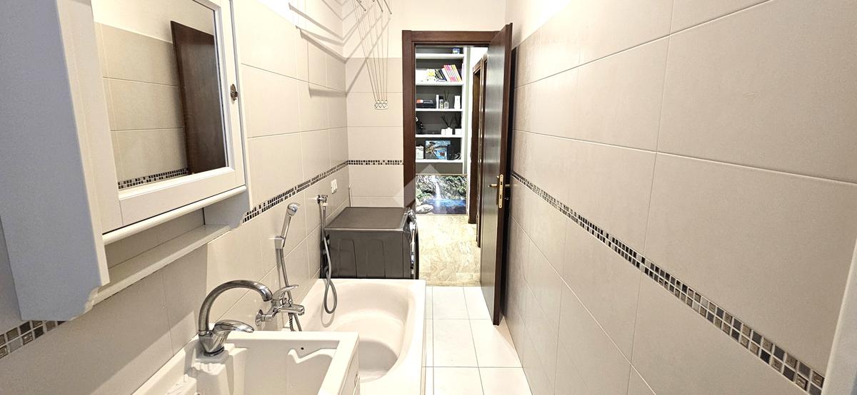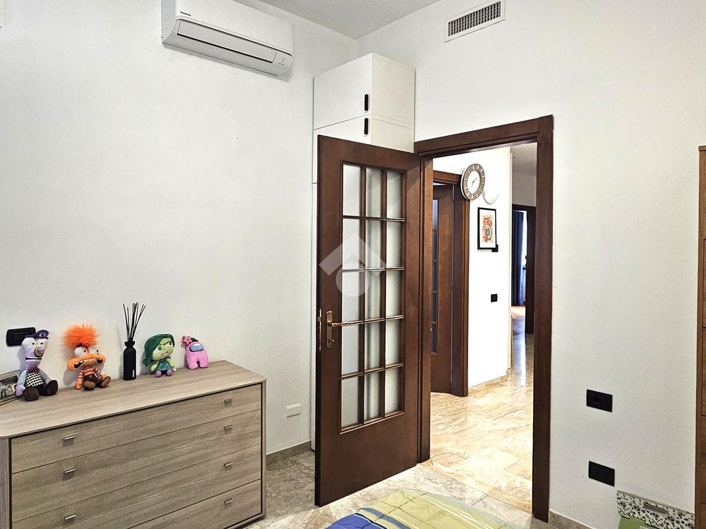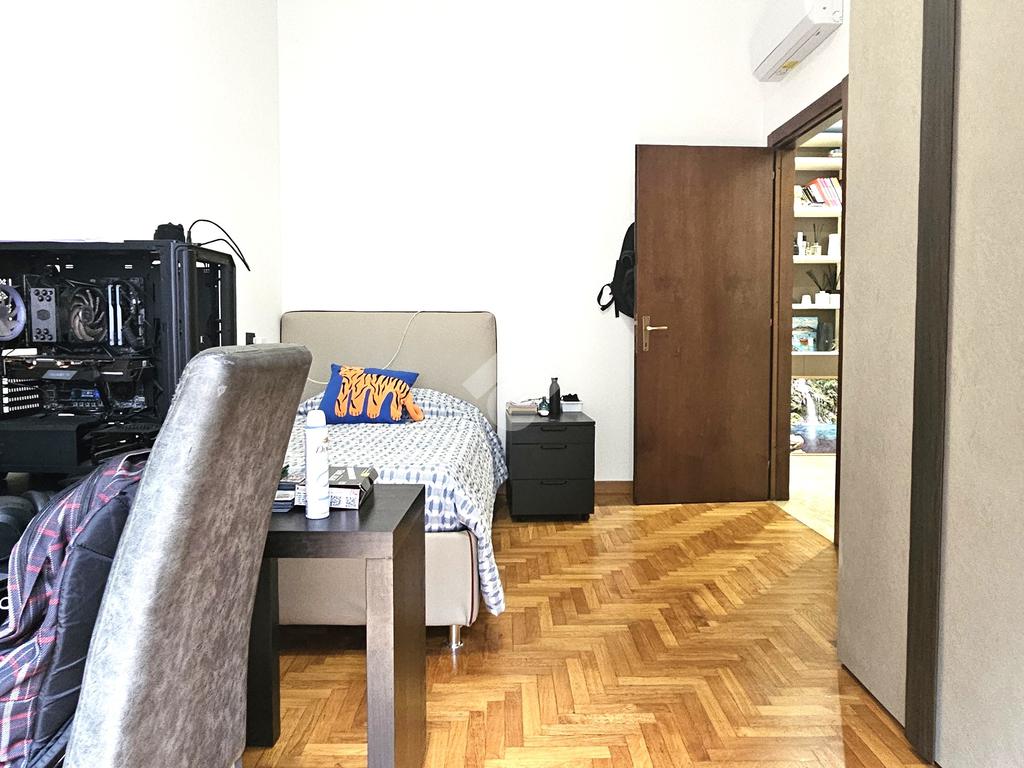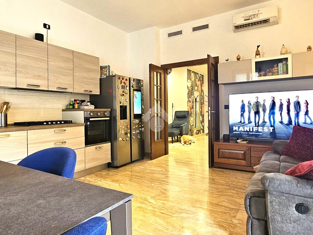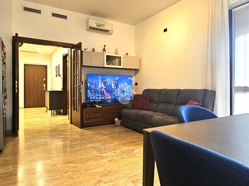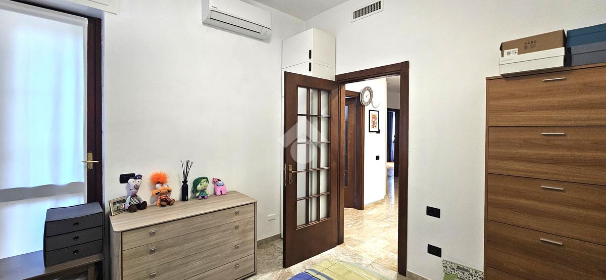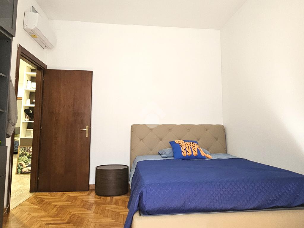 Entrando in casa si accede a un vano ingresso. A sinistra troviamo una cameretta con finestra, una porta-finestra che porta al balcone in comune con il soggiorno-cucina, e una piccola cabina armadio. Frontalmente si entra nel soggiorno/cucina, illuminato da due porte-finestra. La porta-finestra di sinistra porta sul balcone abitabile. La porta-finestra frontale è alla francese. Dall'ingresso, svoltando a destra, sulla sinistra si ha il primo bagno, con doccia, e l'accesso alla camera matrimoniale; a destra la cameretta con balcone; frontalmente un bagno con vasca. Le finiture includono porta di ingresso blindata, infissi in legno con vetro singolo, climatizzazione in tutte le stanze, zanzariere. I bagni sono completamente rifatti. Ai pavimenti si ha marmo nella zona giorno e in una delle camerette, parquet nella camera matrimoniale e nella seconda cameretta, ceramica nei bagni.