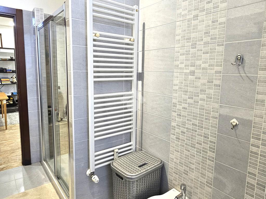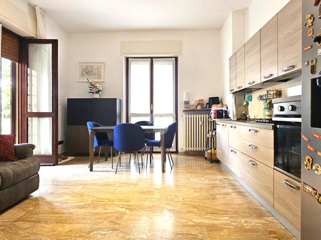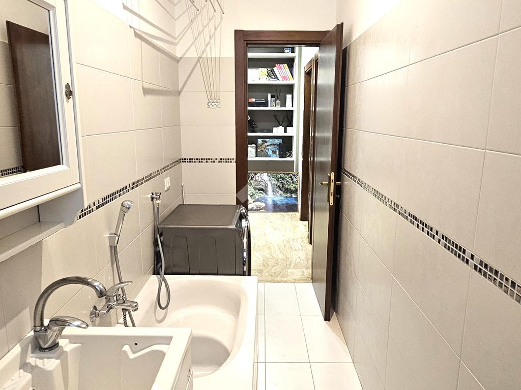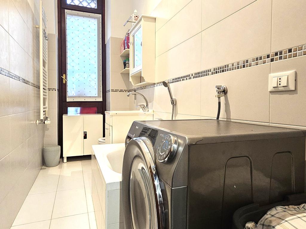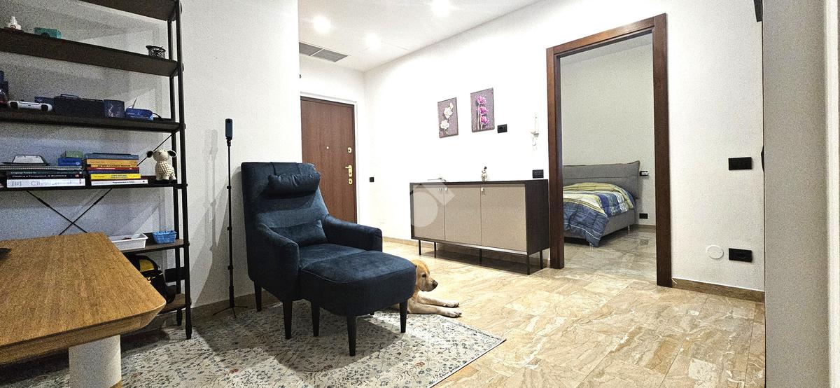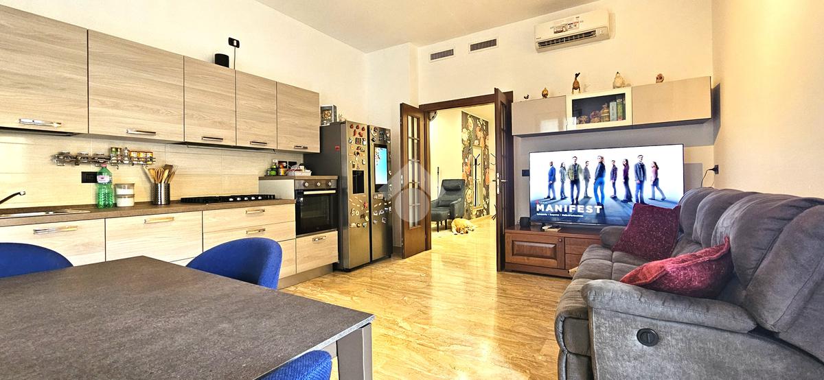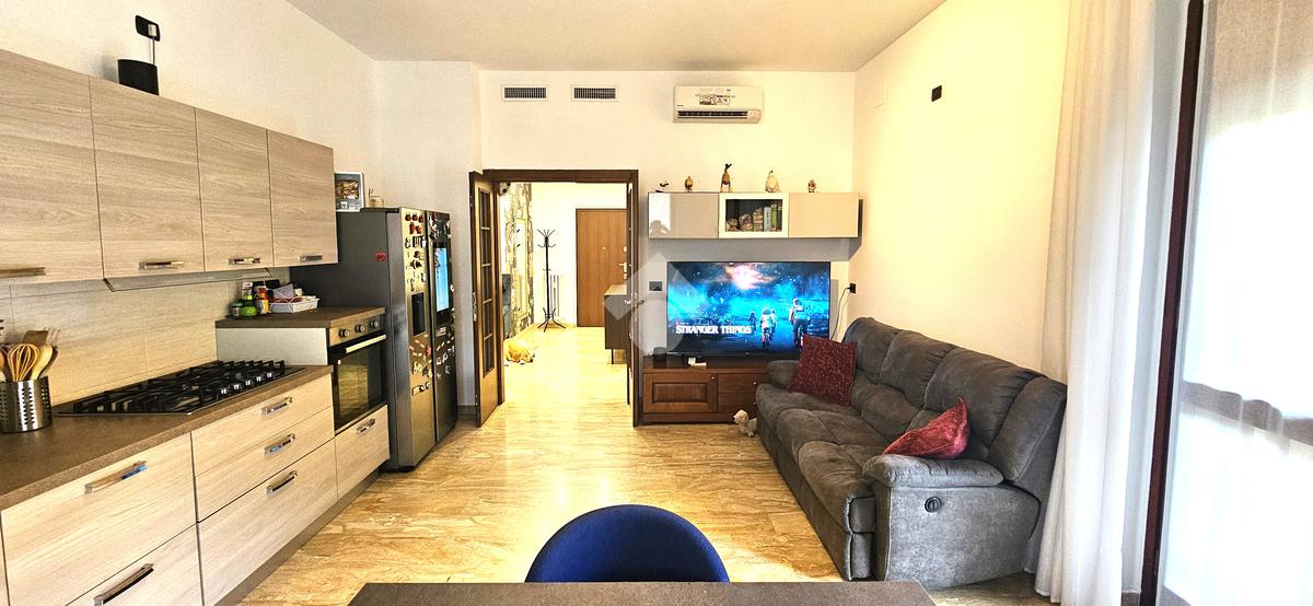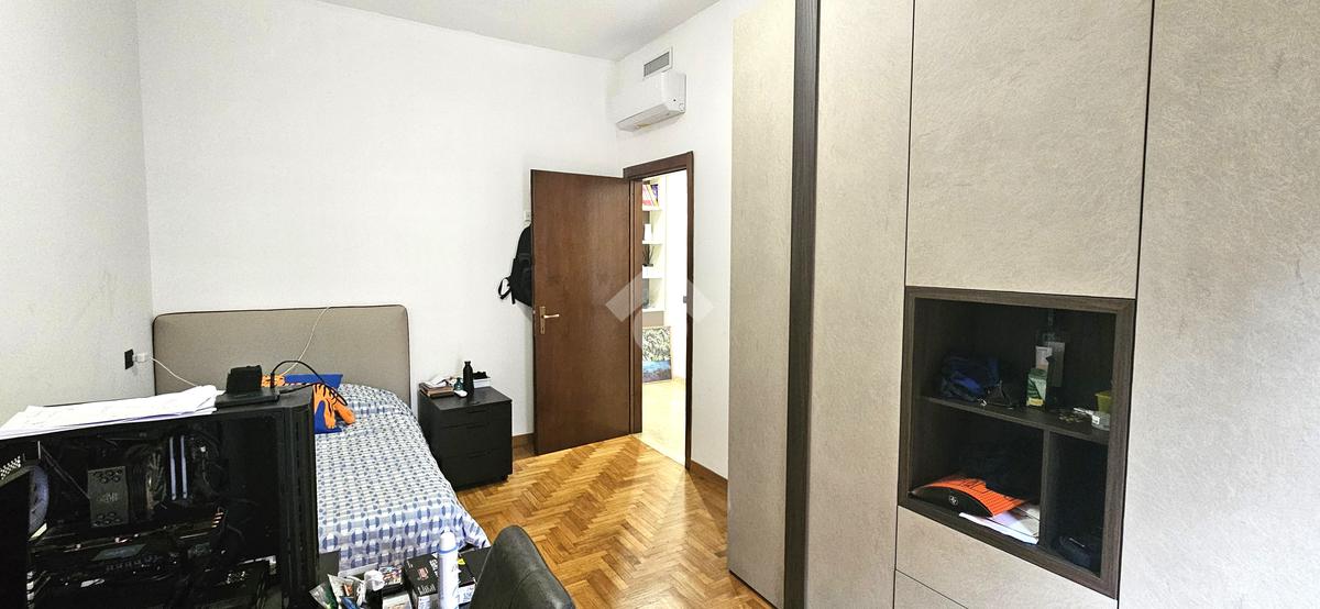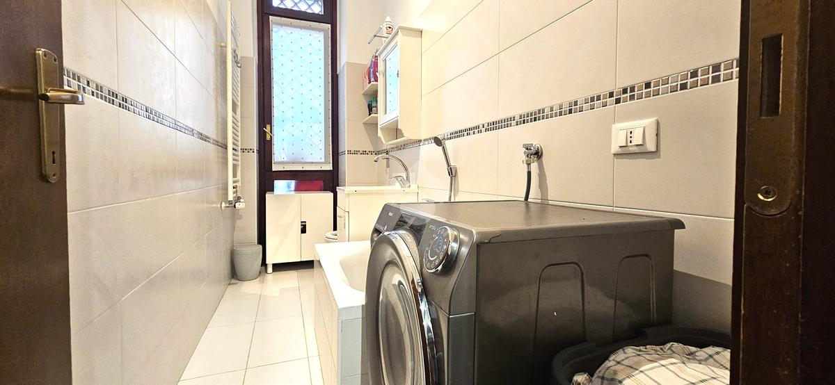Entrando in casa si accede a un vano ingresso. A sinistra troviamo una cameretta con finestra, una porta-finestra che porta al balcone in comune con il soggiorno-cucina, e una piccola cabina armadio. Frontalmente si entra nel soggiorno/cucina, illuminato da due porte-finestra. La porta-finestra di sinistra porta sul balcone abitabile. La porta-finestra frontale è alla francese. Dall'ingresso, svoltando a destra, sulla sinistra si ha il primo bagno, con doccia, e l'accesso alla camera matrimoniale; a destra la cameretta con balcone; frontalmente un bagno con vasca. Le finiture includono porta di ingresso blindata, infissi in legno con vetro singolo, climatizzazione in tutte le stanze, zanzariere. I bagni sono completamente rifatti. Ai pavimenti si ha marmo nella zona giorno e in una delle camerette, parquet nella camera matrimoniale e nella seconda cameretta, ceramica nei bagni.