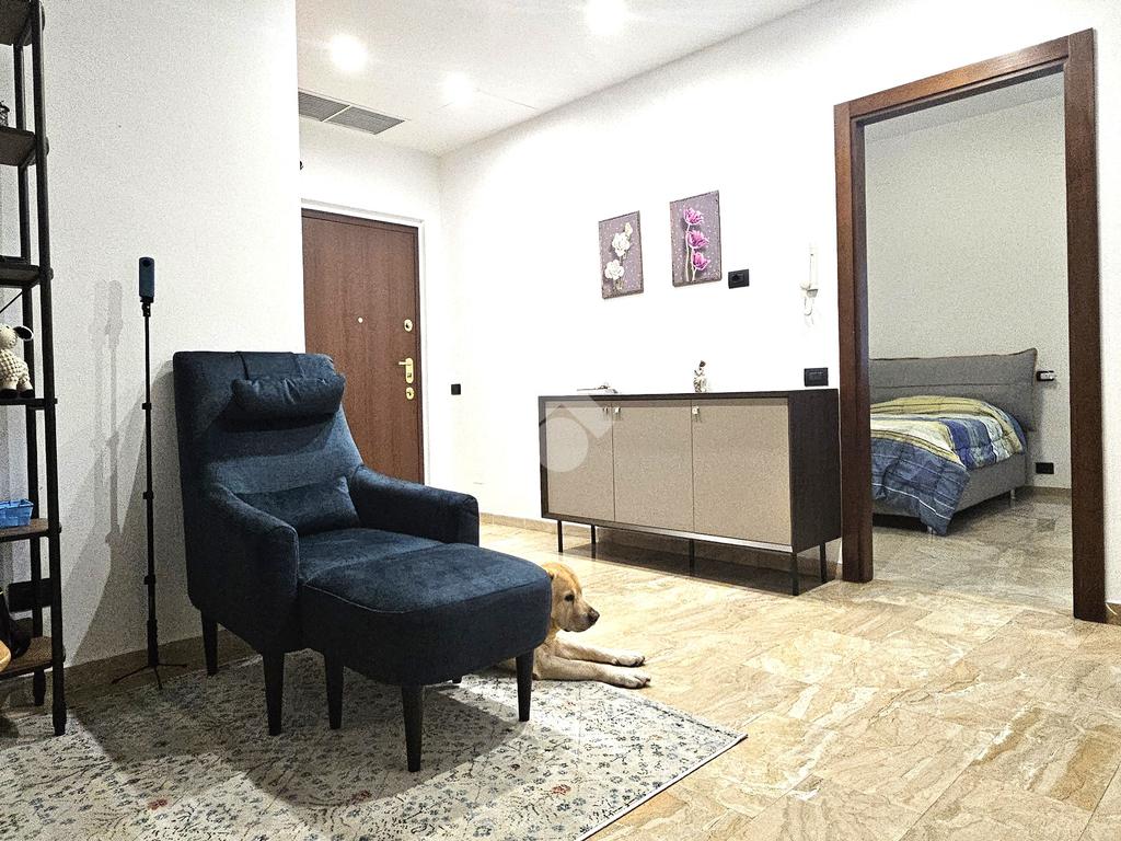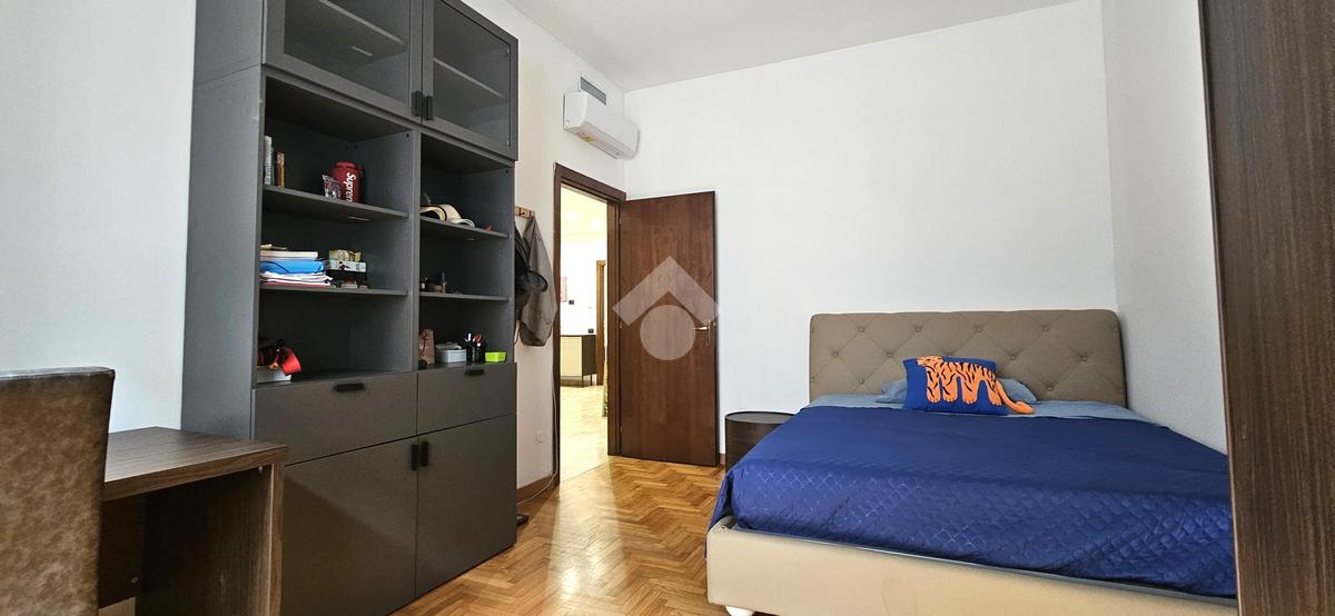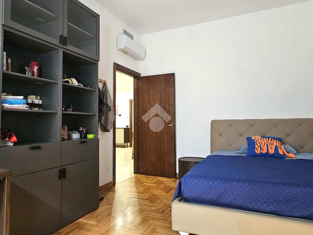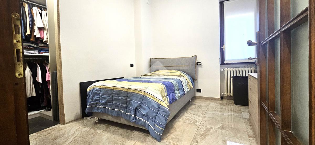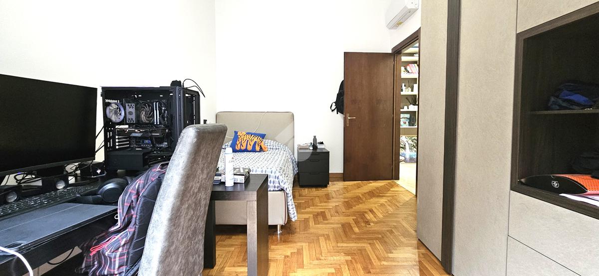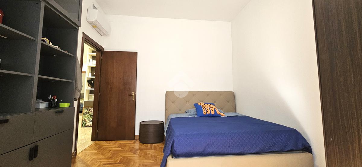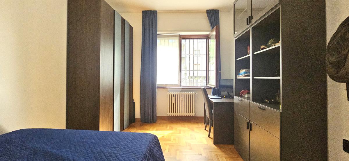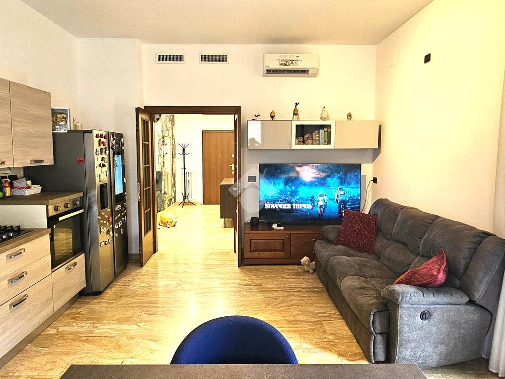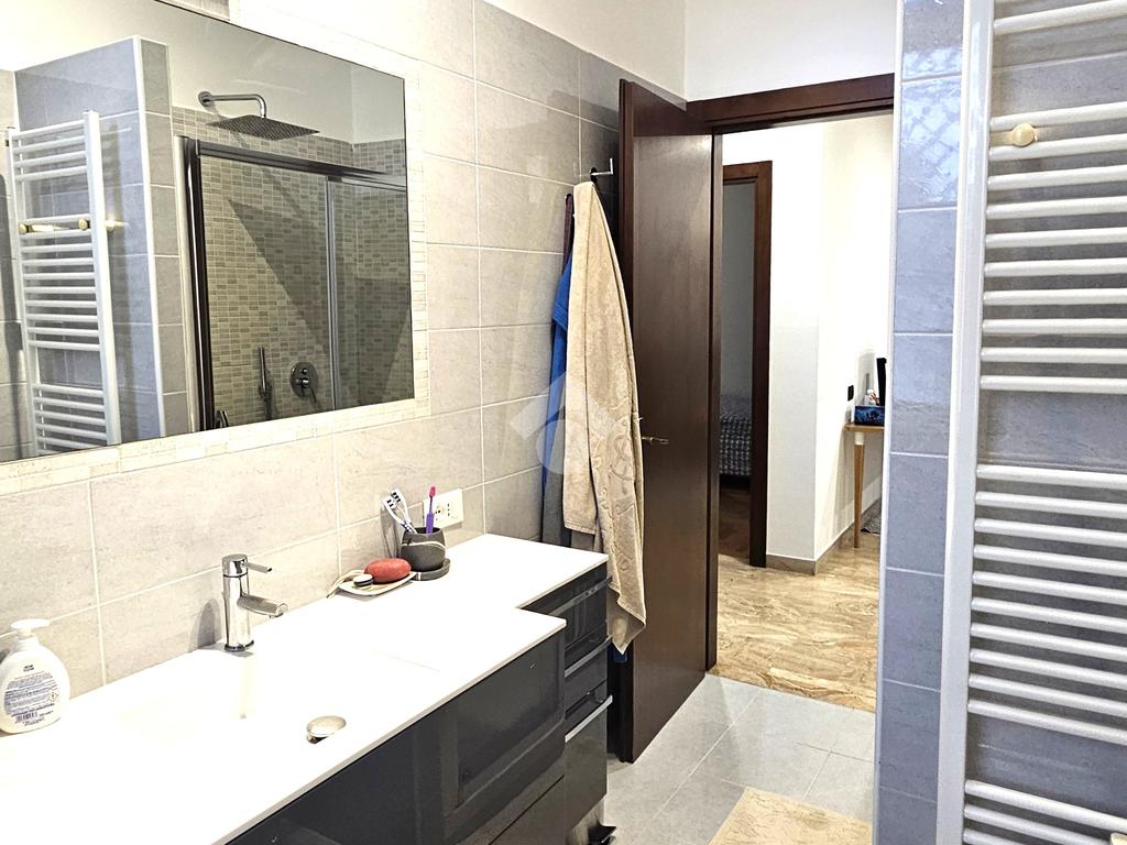 Entrando in casa si accede a un vano ingresso. A sinistra troviamo una cameretta con finestra, una porta-finestra che porta al balcone in comune con il soggiorno-cucina, e una piccola cabina armadio. Frontalmente si entra nel soggiorno/cucina, illuminato da due porte-finestra. La porta-finestra di sinistra porta sul balcone abitabile. La porta-finestra frontale è alla francese. Dall'ingresso, svoltando a destra, sulla sinistra si ha il primo bagno, con doccia, e l'accesso alla camera matrimoniale; a destra la cameretta con balcone; frontalmente un bagno con vasca. Le finiture includono porta di ingresso blindata, infissi in legno con vetro singolo, climatizzazione in tutte le stanze, zanzariere. I bagni sono completamente rifatti. Ai pavimenti si ha marmo nella zona giorno e in una delle camerette, parquet nella camera matrimoniale e nella seconda cameretta, ceramica nei bagni.