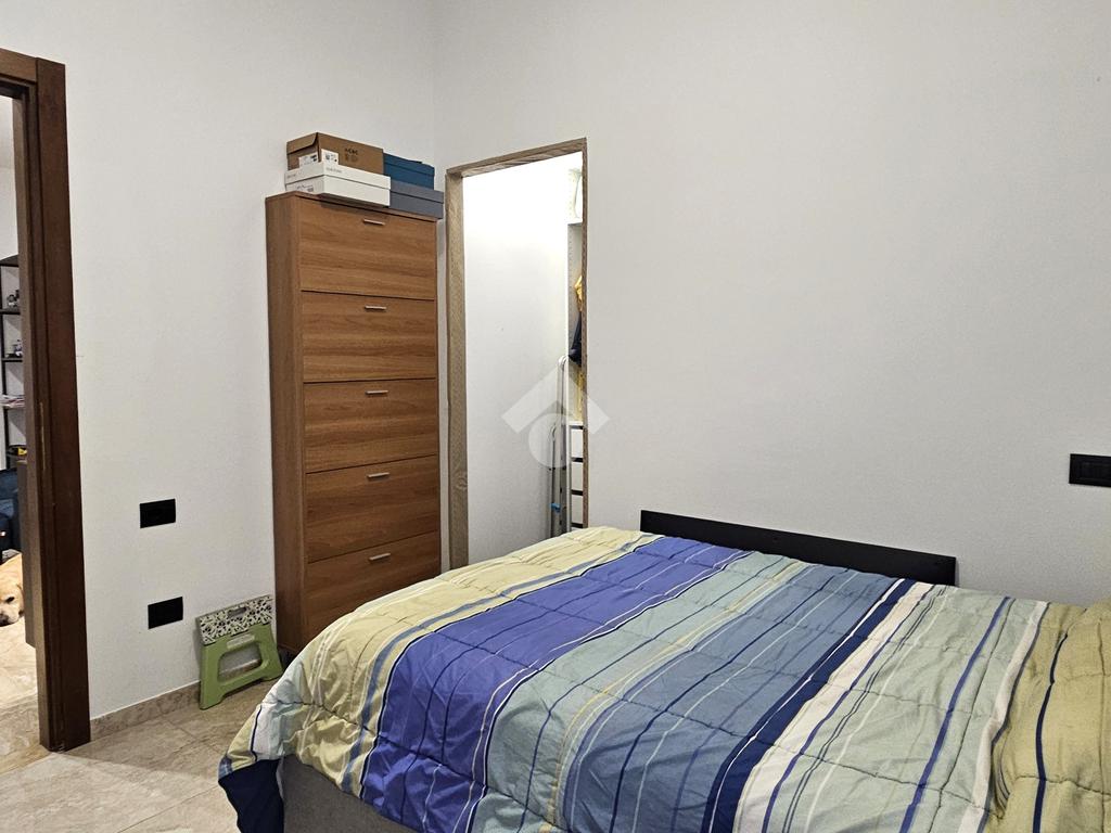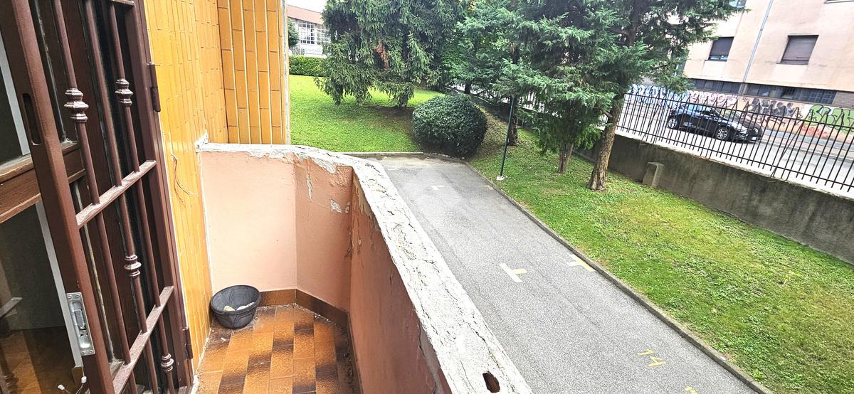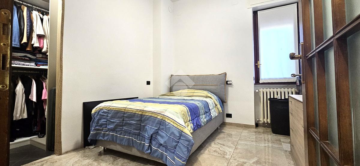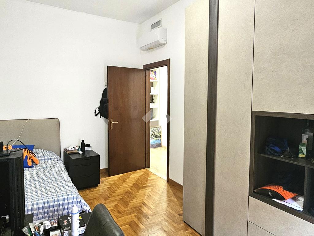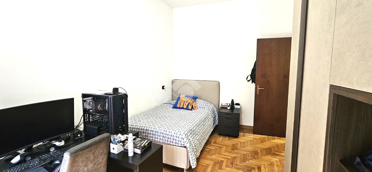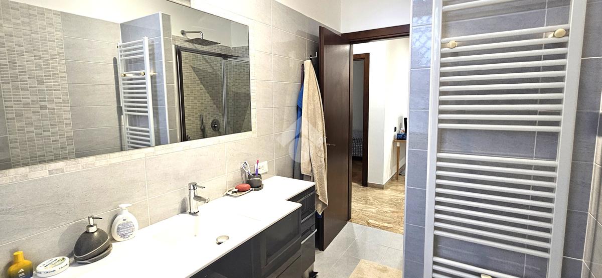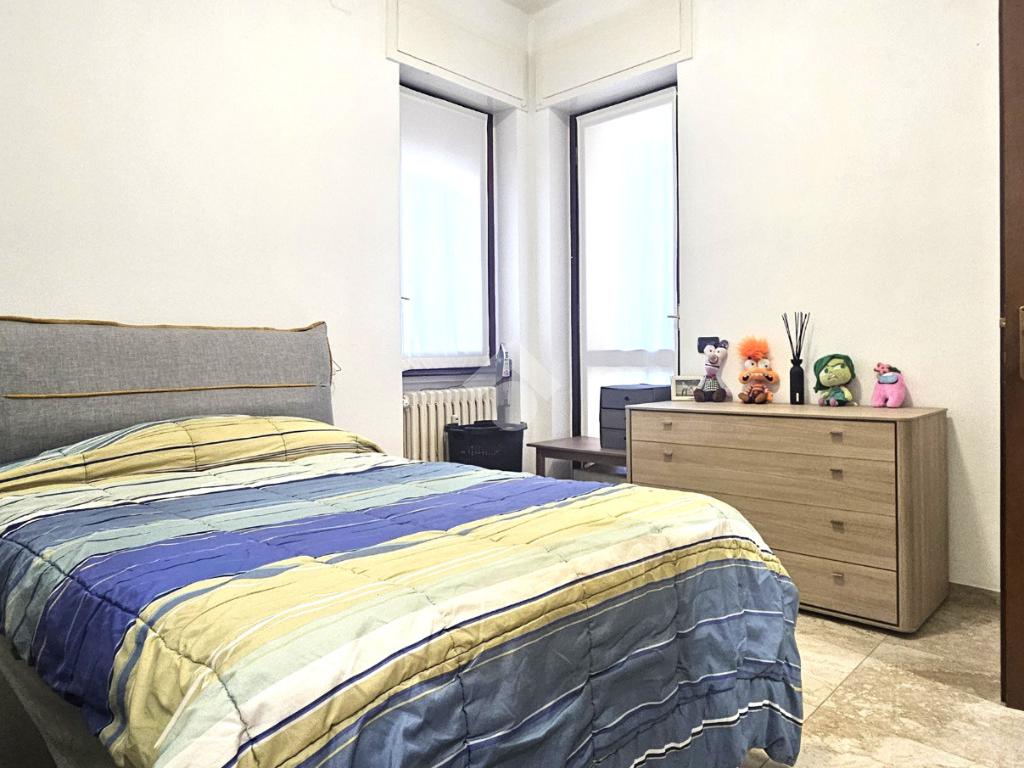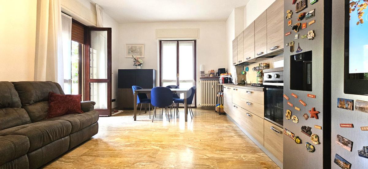Entrando in casa si accede a un vano ingresso. A sinistra troviamo una cameretta con finestra, una porta-finestra che porta al balcone in comune con il soggiorno-cucina, e una piccola cabina armadio. Frontalmente si entra nel soggiorno/cucina, illuminato da due porte-finestra. La porta-finestra di sinistra porta sul balcone abitabile. La porta-finestra frontale è alla francese. Dall'ingresso, svoltando a destra, sulla sinistra si ha il primo bagno, con doccia, e l'accesso alla camera matrimoniale; a destra la cameretta con balcone; frontalmente un bagno con vasca. Le finiture includono porta di ingresso blindata, infissi in legno con vetro singolo, climatizzazione in tutte le stanze, zanzariere. I bagni sono completamente rifatti. Ai pavimenti si ha marmo nella zona giorno e in una delle camerette, parquet nella camera matrimoniale e nella seconda cameretta, ceramica nei bagni.