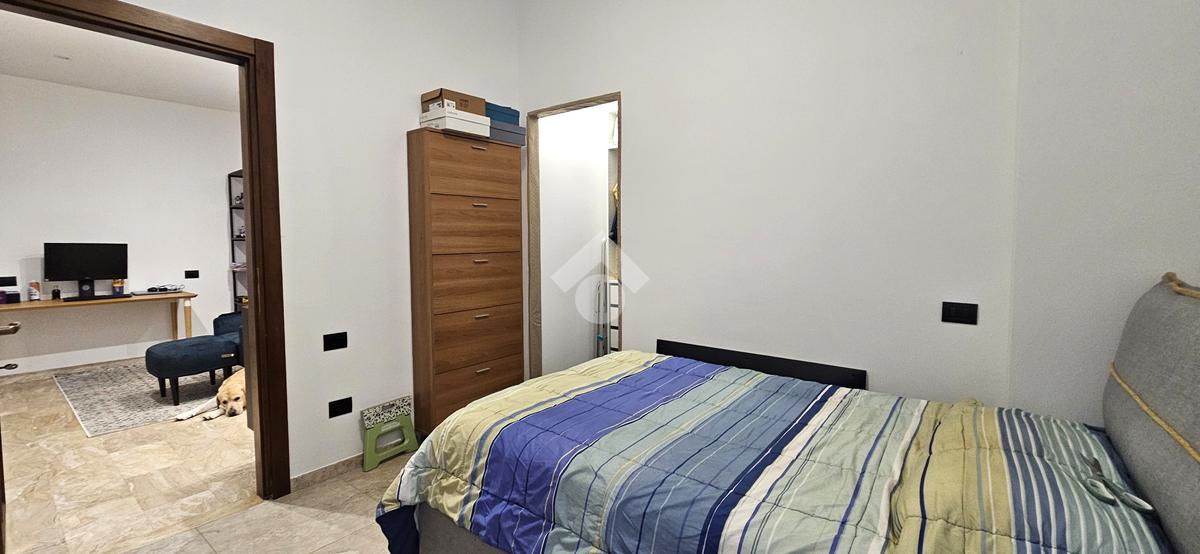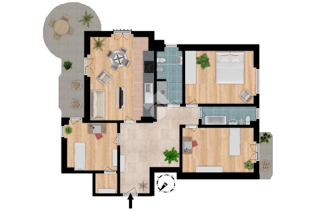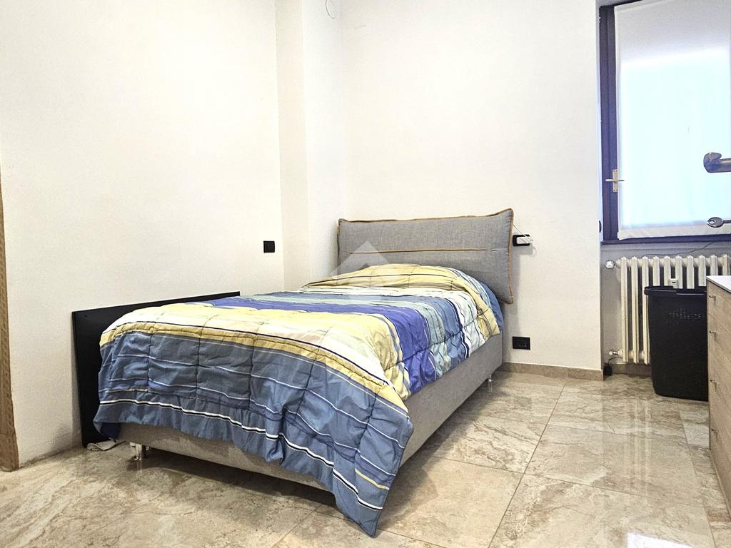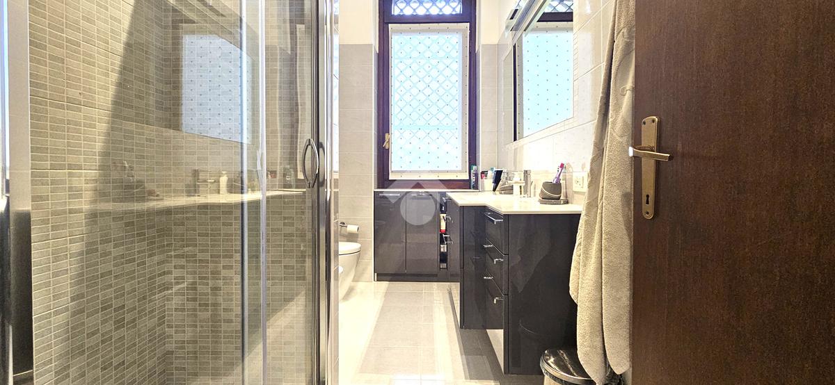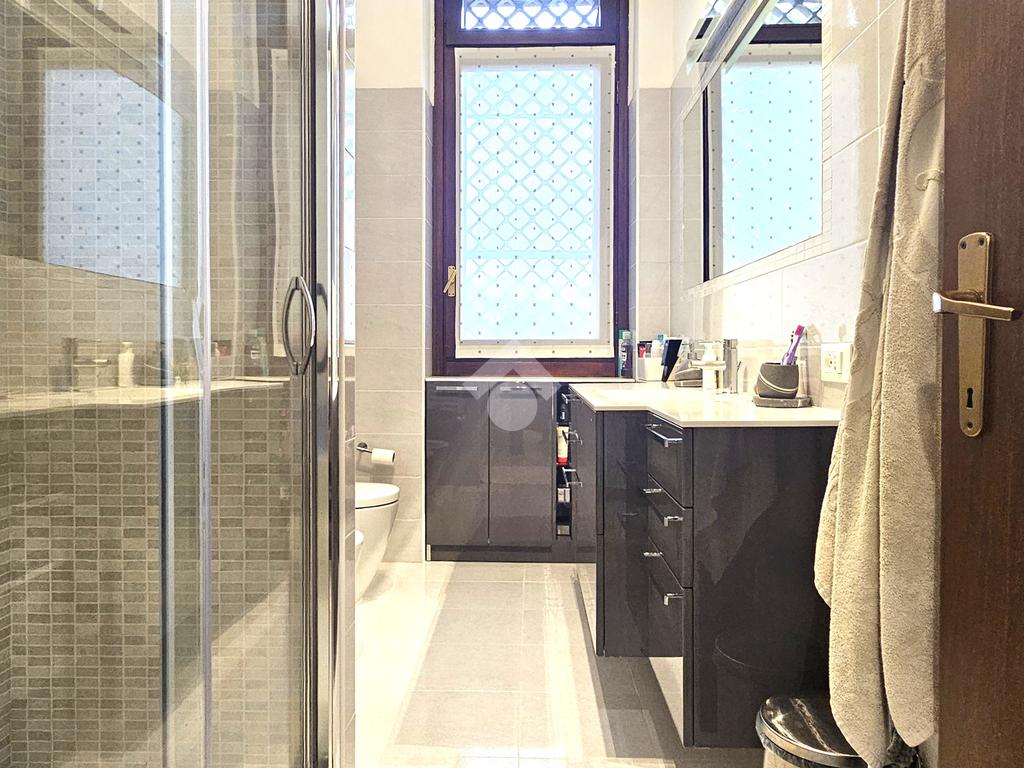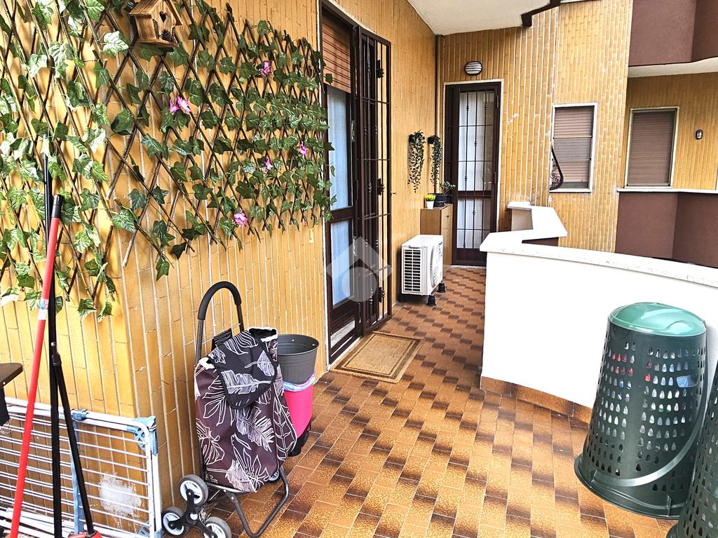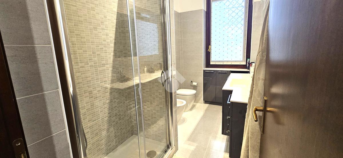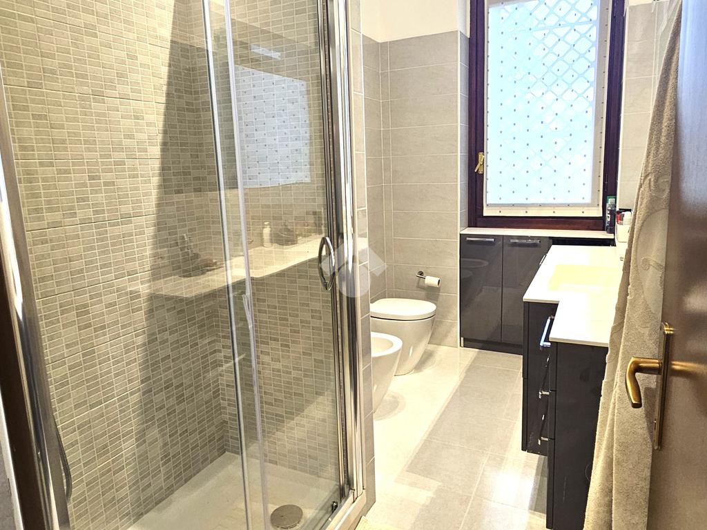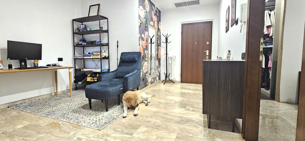 Entrando in casa si accede a un vano ingresso. A sinistra troviamo una cameretta con finestra, una porta-finestra che porta al balcone in comune con il soggiorno-cucina, e una piccola cabina armadio. Frontalmente si entra nel soggiorno/cucina, illuminato da due porte-finestra. La porta-finestra di sinistra porta sul balcone abitabile. La porta-finestra frontale è alla francese. Dall'ingresso, svoltando a destra, sulla sinistra si ha il primo bagno, con doccia, e l'accesso alla camera matrimoniale; a destra la cameretta con balcone; frontalmente un bagno con vasca. Le finiture includono porta di ingresso blindata, infissi in legno con vetro singolo, climatizzazione in tutte le stanze, zanzariere. I bagni sono completamente rifatti. Ai pavimenti si ha marmo nella zona giorno e in una delle camerette, parquet nella camera matrimoniale e nella seconda cameretta, ceramica nei bagni.