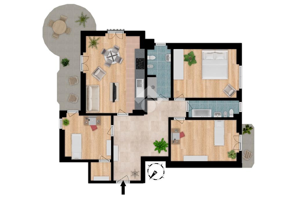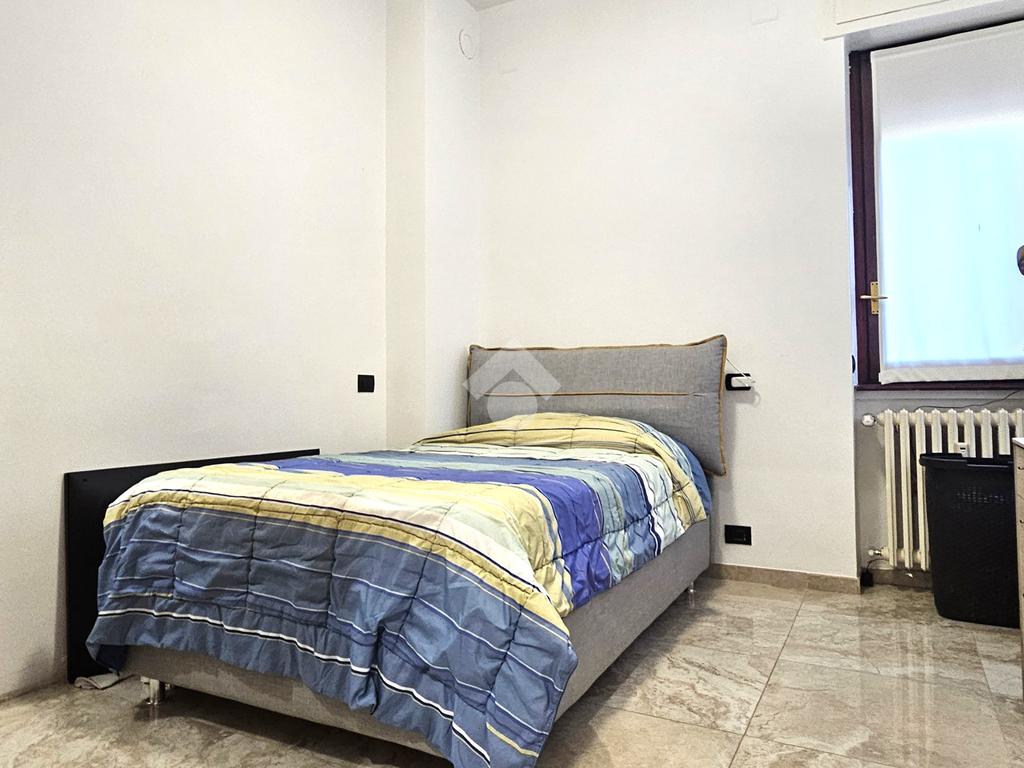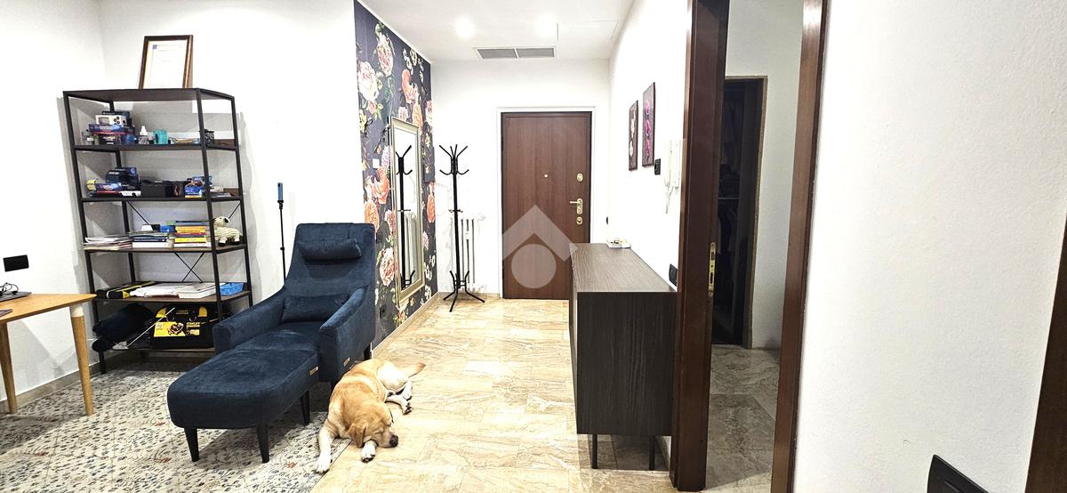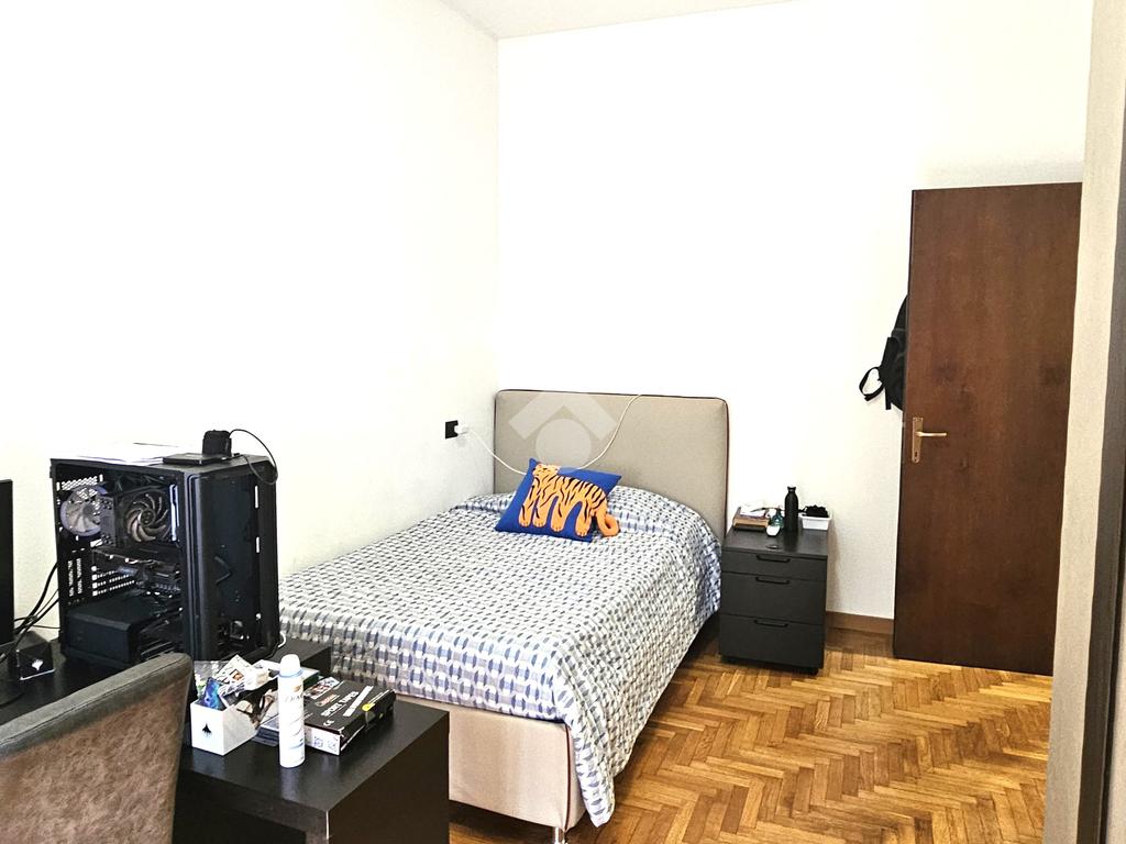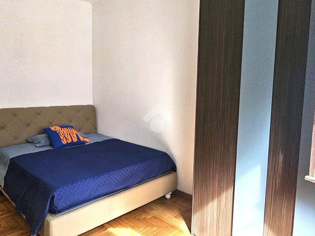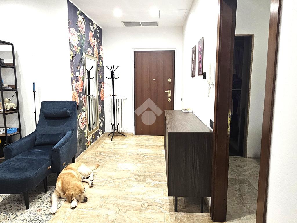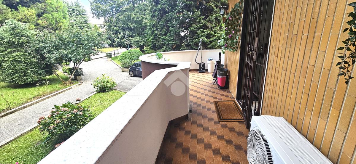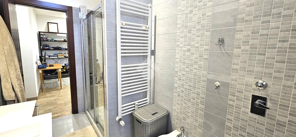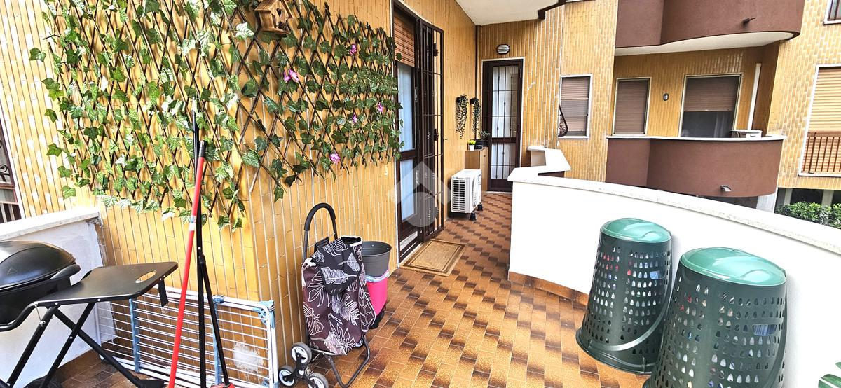 Entrando in casa si accede a un vano ingresso. A sinistra troviamo una cameretta con finestra, una porta-finestra che porta al balcone in comune con il soggiorno-cucina, e una piccola cabina armadio. Frontalmente si entra nel soggiorno/cucina, illuminato da due porte-finestra. La porta-finestra di sinistra porta sul balcone abitabile. La porta-finestra frontale è alla francese. Dall'ingresso, svoltando a destra, sulla sinistra si ha il primo bagno, con doccia, e l'accesso alla camera matrimoniale; a destra la cameretta con balcone; frontalmente un bagno con vasca. Le finiture includono porta di ingresso blindata, infissi in legno con vetro singolo, climatizzazione in tutte le stanze, zanzariere. I bagni sono completamente rifatti. Ai pavimenti si ha marmo nella zona giorno e in una delle camerette, parquet nella camera matrimoniale e nella seconda cameretta, ceramica nei bagni.