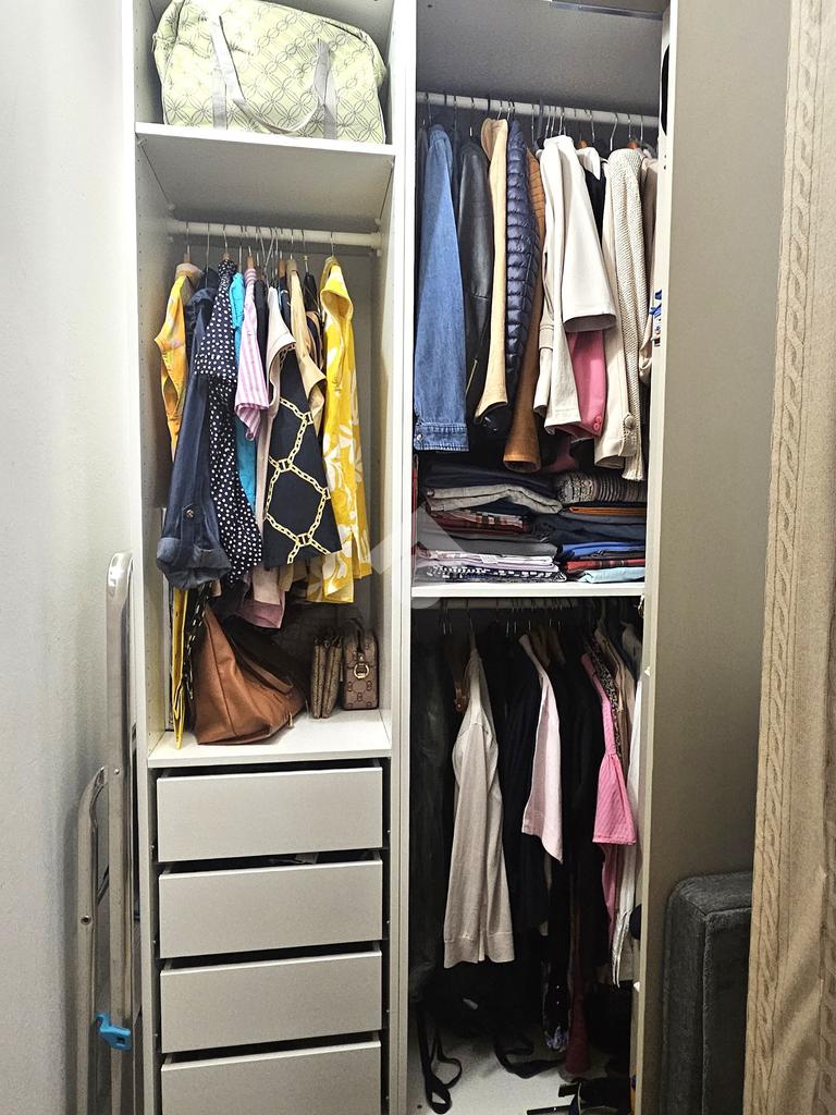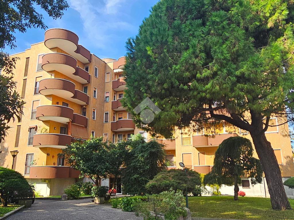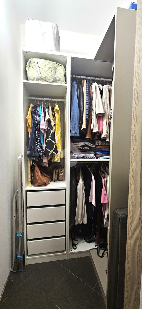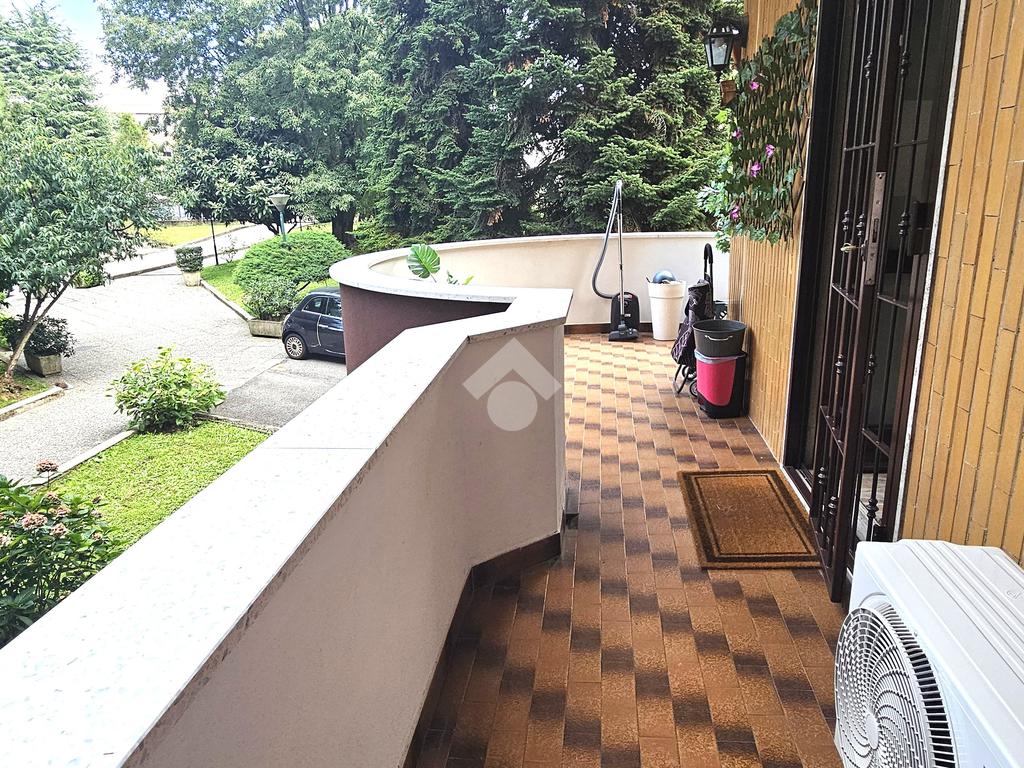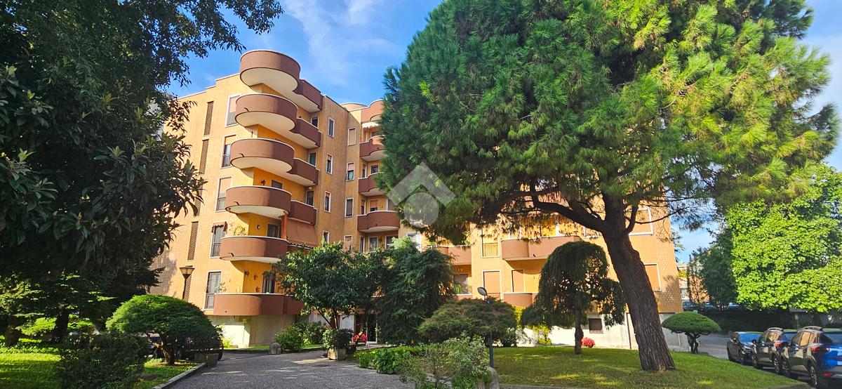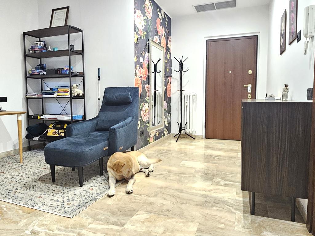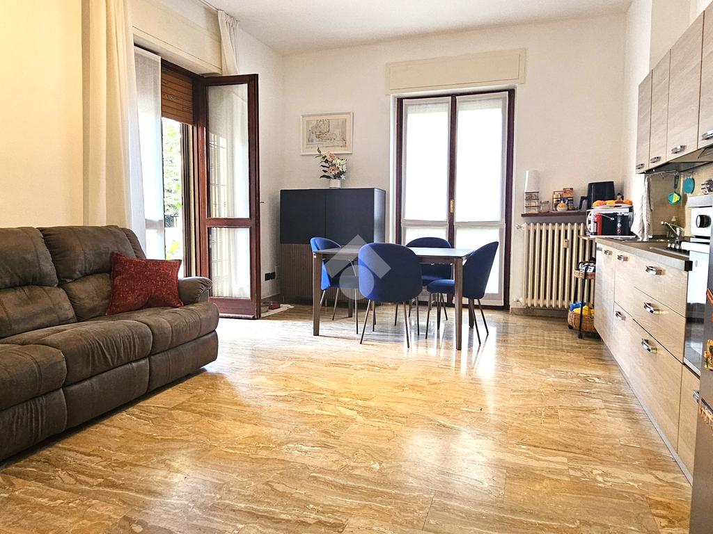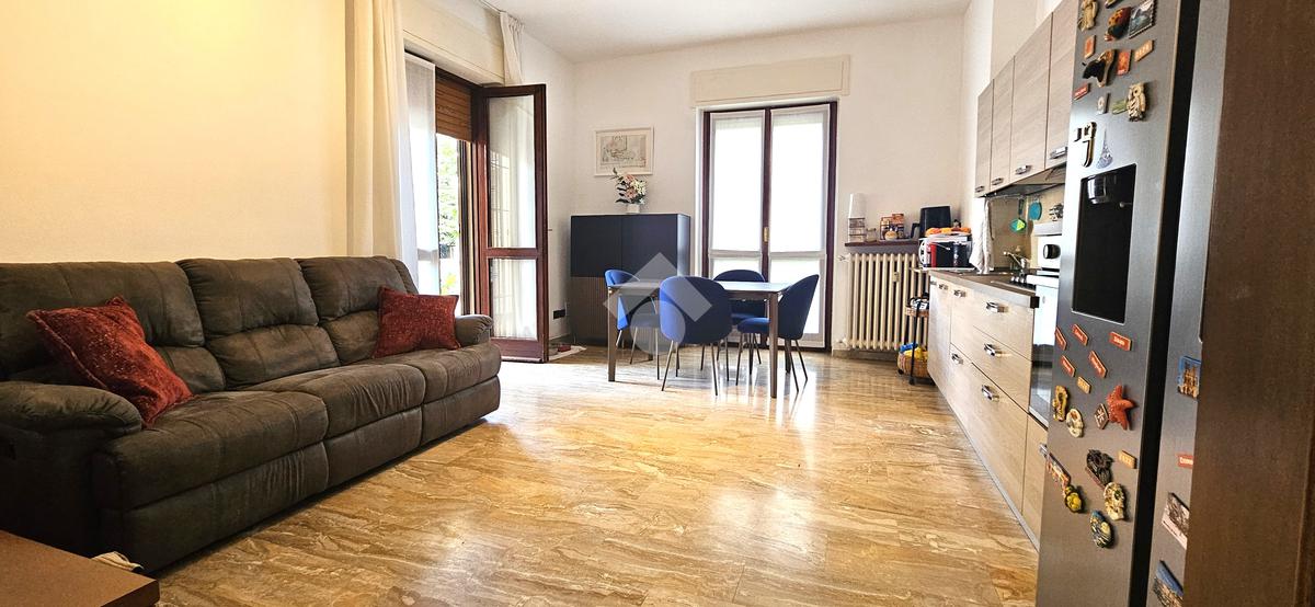 Entrando in casa si accede a un vano ingresso. A sinistra troviamo una cameretta con finestra, una porta-finestra che porta al balcone in comune con il soggiorno-cucina, e una piccola cabina armadio. Frontalmente si entra nel soggiorno/cucina, illuminato da due porte-finestra. La porta-finestra di sinistra porta sul balcone abitabile. La porta-finestra frontale è alla francese. Dall'ingresso, svoltando a destra, sulla sinistra si ha il primo bagno, con doccia, e l'accesso alla camera matrimoniale; a destra la cameretta con balcone; frontalmente un bagno con vasca. Le finiture includono porta di ingresso blindata, infissi in legno con vetro singolo, climatizzazione in tutte le stanze, zanzariere. I bagni sono completamente rifatti. Ai pavimenti si ha marmo nella zona giorno e in una delle camerette, parquet nella camera matrimoniale e nella seconda cameretta, ceramica nei bagni.